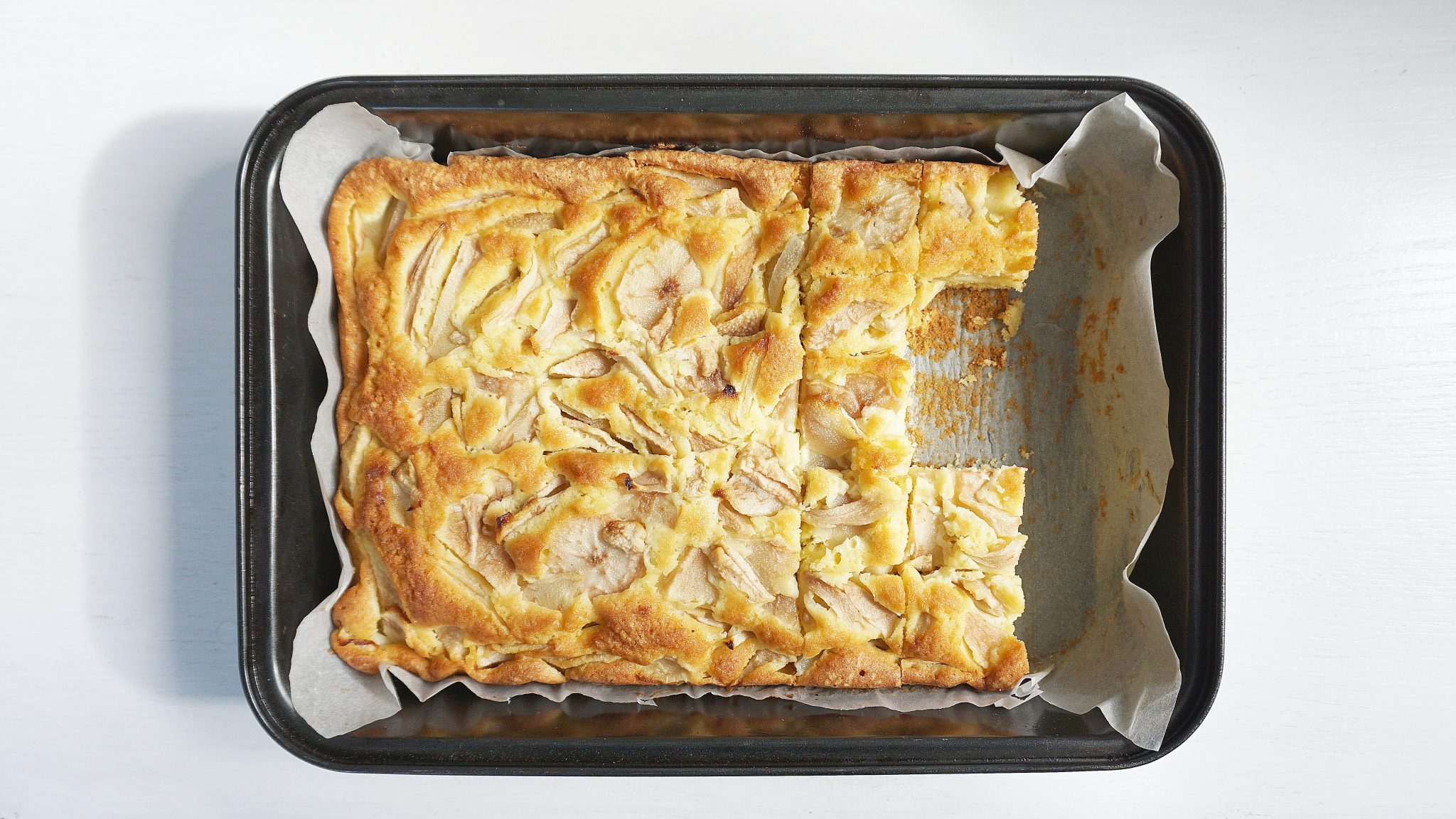 - Ciasto wyłożyć do blaszki, a na górze ułożyć pokrojone gruszki. Powinny zakryć całą powierzchnię ciasta.